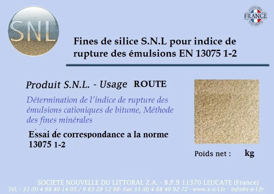 Les fines de silice S.N.L pour indice de rupture des emulsions EN 13075 1-2 est un sable fin de la même origine que l’ancien Sikaisol -Annexe B
