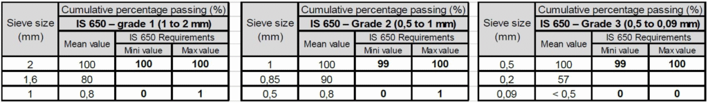 La courbe granulométrique de chaque fraction de sable est selon la norme IS650